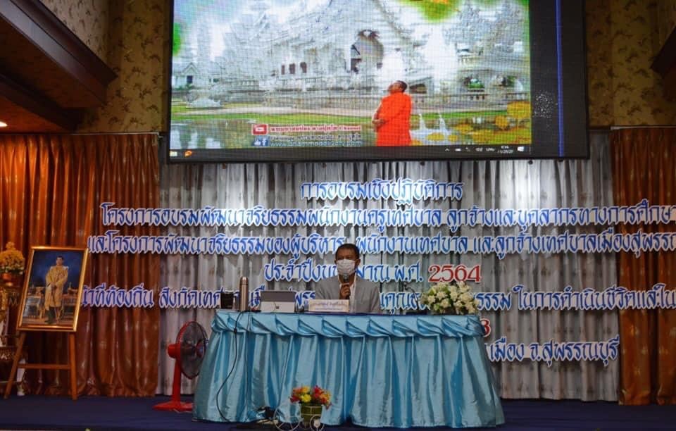 ผอ.ยุวลักษณ์ ชาติชำนาญ ผู้อำนวยการสถานศึกษาฯ นำคณะครูและบุคลากรทางการศึกษา เข้าร่วมการอบรมเชิงปฏิบัติการโครงการอบรมพัฒนาจริยธรรมพนักงานครูเทสบาล ลูกจ้างและบุคลากรทางการศึกษา ประจำปีงบประมาณ ๒๕๖๔ เพื่อพัฒนาเสริมสร้างผู้ประกอบวิชาชีพทางการศึกษา ผู้บริหารสถานศึกษา พนักงานครูเทศบาล ลูกจ้าง และบุคลากรทางการศึกษา สังกัดเทศบาลเมืองสุพรรณบุรีให้ประพฤติปฏิบัติตนด้านคุณธรรม จริยธรรมและจรรยาบรรณของวิชาชีพในการดำเนินชีวิตและในการปฏิบัติราชการ ระหว่างวันที่ ๒๘-๒๙ พฤศจิกายน ๒๕๖๓ ณ ห้องแกรนด์บอลรูม ๒ โรงแรมคุ้มสุพรรณ อำเภอเมืองสุพรรณบุรี จังหวัดสุพรรณบุรี
