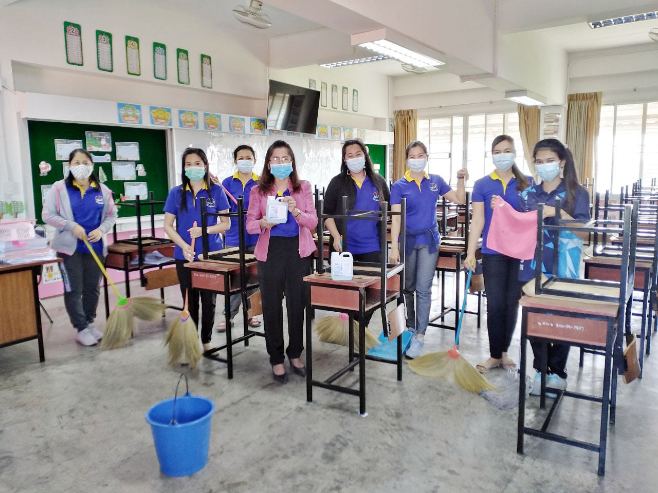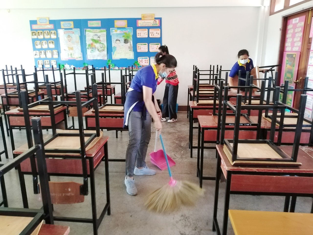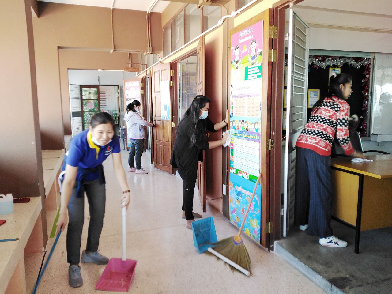 ผอ.ยุวลักษณ์ ชาติชำนาญ ผู้อำนวยการสถานศึกษาฯ ต้อนรับ ผอ.ดำรงค์ธณัช สวัสดิพรรณ์ ผู้อำนวยการกองการศึกษาฯ ที่มาตรวจเยี่ยมคณะครูร่วมทำกิจกรรม Big Cleaning อาคารสถานที่และสื่อวัสดุอุปกรณ์ที่เกี่ยวข้องกับการเรียนการสอนภายในห้องเรียน ตามสถานการณ์โคโรน่า (COVID-19) เพื่อป้องกันและควบคุมเชื้อโคโรน่า (COVID-19) วันที่ ๒๔ ธันวาคม ๒๕๖๓ ณ โรงเรียนเทศบาล ๔ วัดศรีบัวบาน