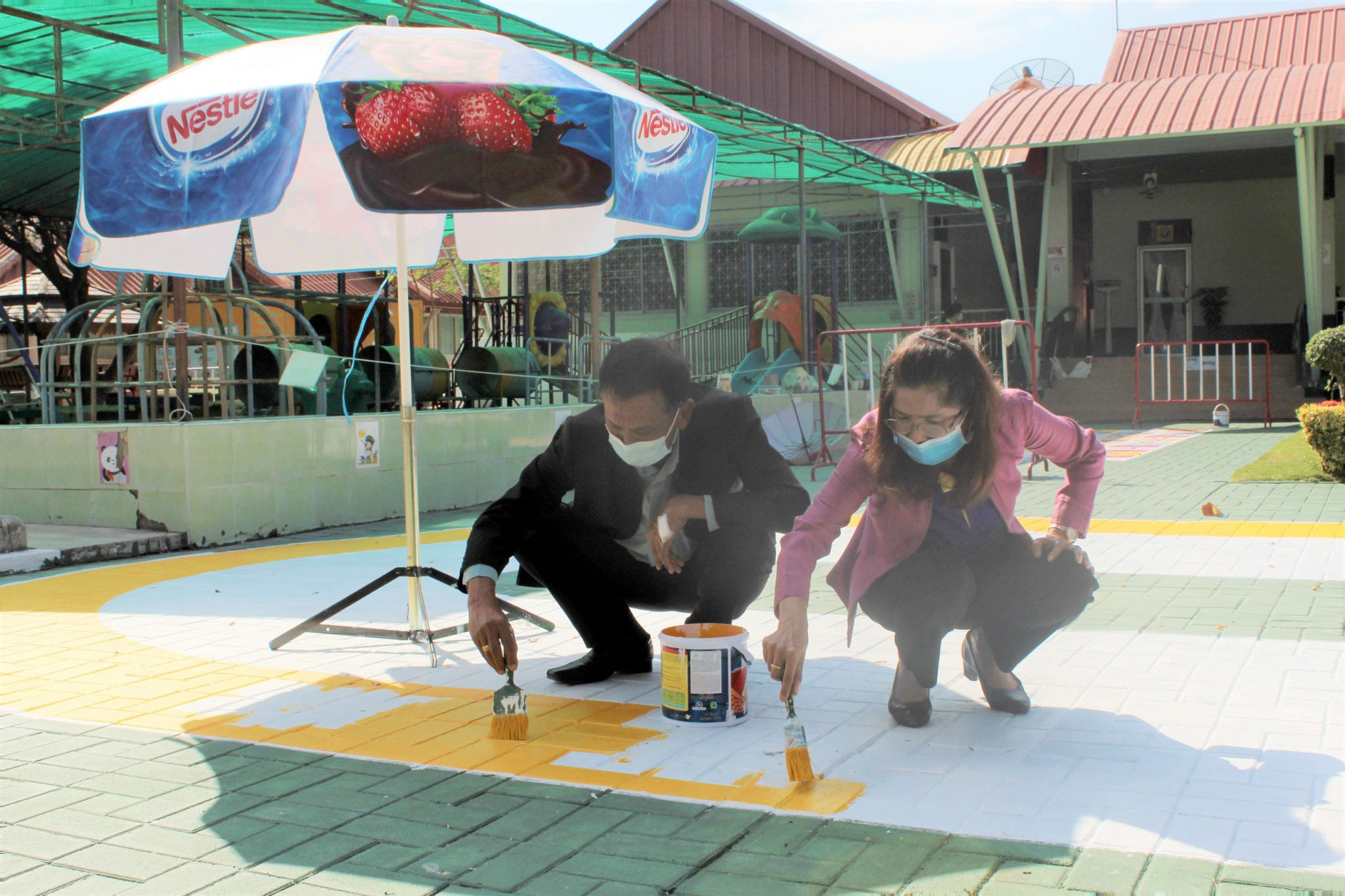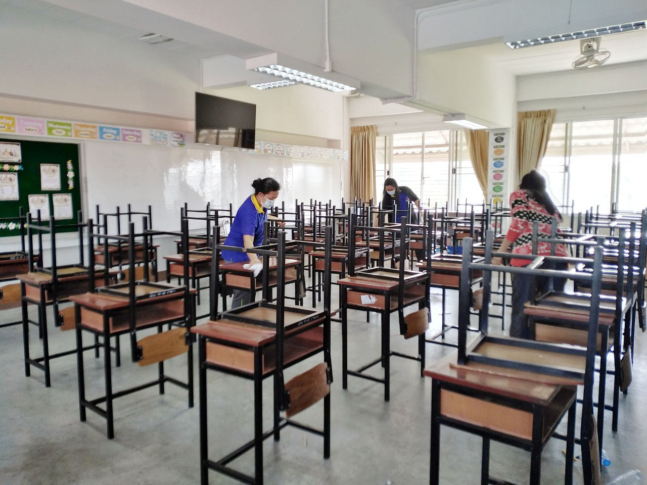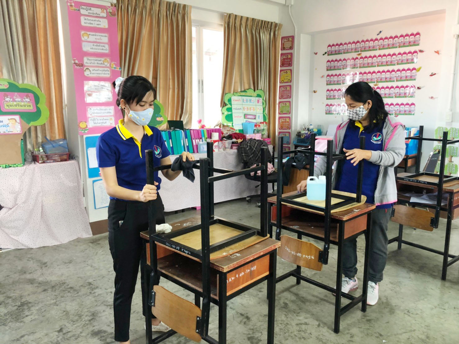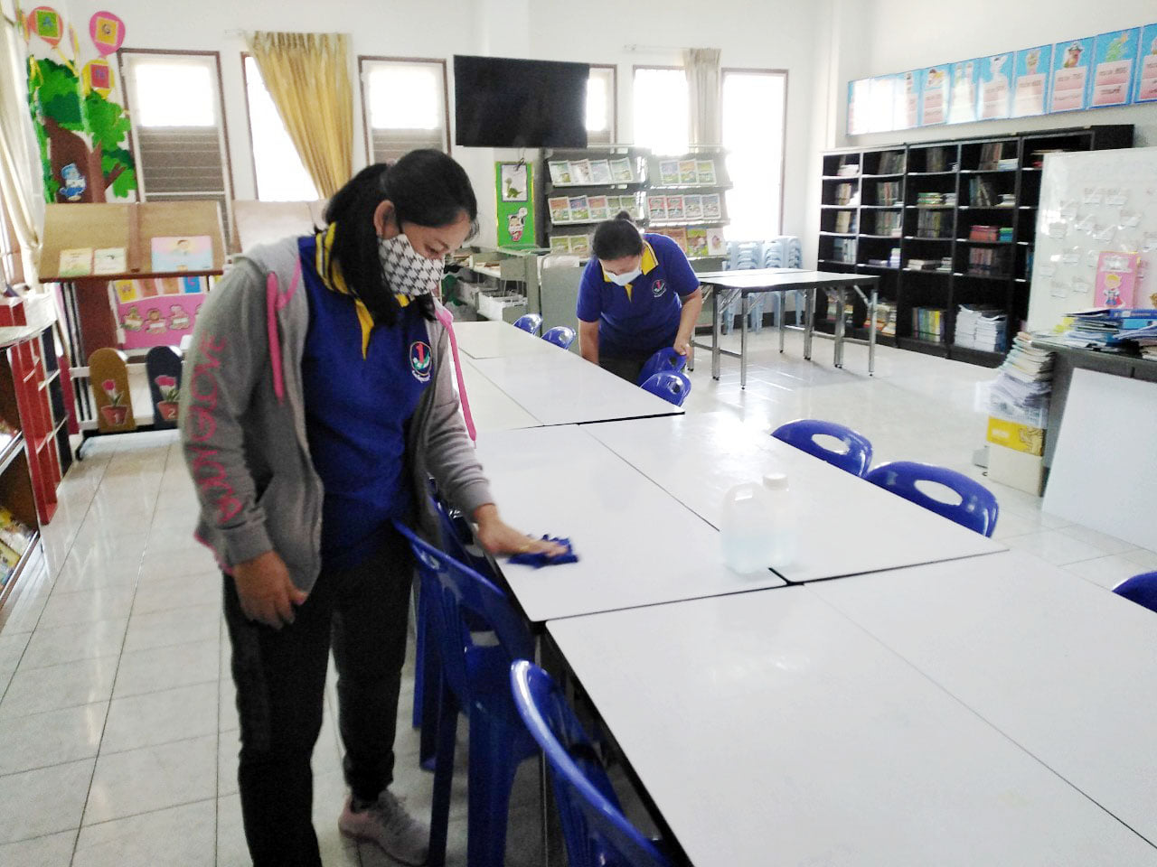 ผอ.ยุวลักษณ์ ชาติชำนาญ ผู้อำนวยการสถานศึกษาฯ ต้อนรับ ผอ.ดำรงค์ธณัช สวัสดิพรรณ์ ผู้อำนวยการกองการศึกษาฯ ที่มาตรวจเยี่ยมคณะครูร่วมทำกิจกรรม Big Cleaning อาคารสถานที่และสื่อวัสดุอุปกรณ์ที่เกี่ยวข้องกับการเรียนการสอนภายในห้องเรียน ตามสถานการณ์โคโรน่า (COVID-19) เพื่อป้องกันและควบคุมเชื้อโคโรน่า (COVID-19) วันที่ ๒๔ ธันวาคม ๒๕๖๓ ณ โรงเรียนเทศบาล ๔ วัดศรีบัวบาน