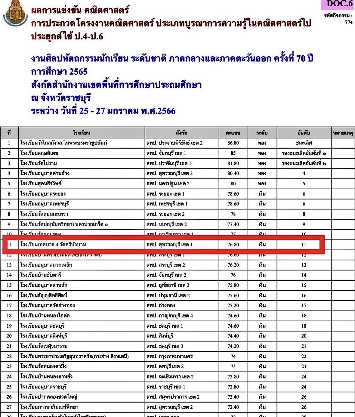 ขอแสดงความยินดีกับเด็กหญิงศุภสิตา แย้มวงศ์, เด็กหญิงมาริสา อ่อนใส และเด็กหญิงสุคนธ์ทิพย์ อาคมคง คุณครูผู้ฝึกซ้อม คุณครูกรกมล เมธีวรกิจ คุณครูอภิญญา ชวลิต ในการเข้าร่วม "การประกวดโครงงานคณิตศาสตร์ ประเภทบูรณาการความรู้ในคณิตศาสตร์ไปประยุกต์ใช้ ป.๔-ป.๖" งานศิลปหัตถกรรมนักเรียน ระดับชาติ ภาคกลางและภาคตะวันออก ครั้งที่ ๗๐ ปีการศึกษา ๒๕๖๕ สังกัดสำนักงานเขตพื้นที่การศึกษาประถมศึกษา ณ จังหวัดราชบุรี ระหว่างวันที่ ๒๕-๒๗ มกราคม ๒๕๖๖ ผลการแข่งขันได้รับรางวัลเหรียญเงิน อันดับ ๑๑