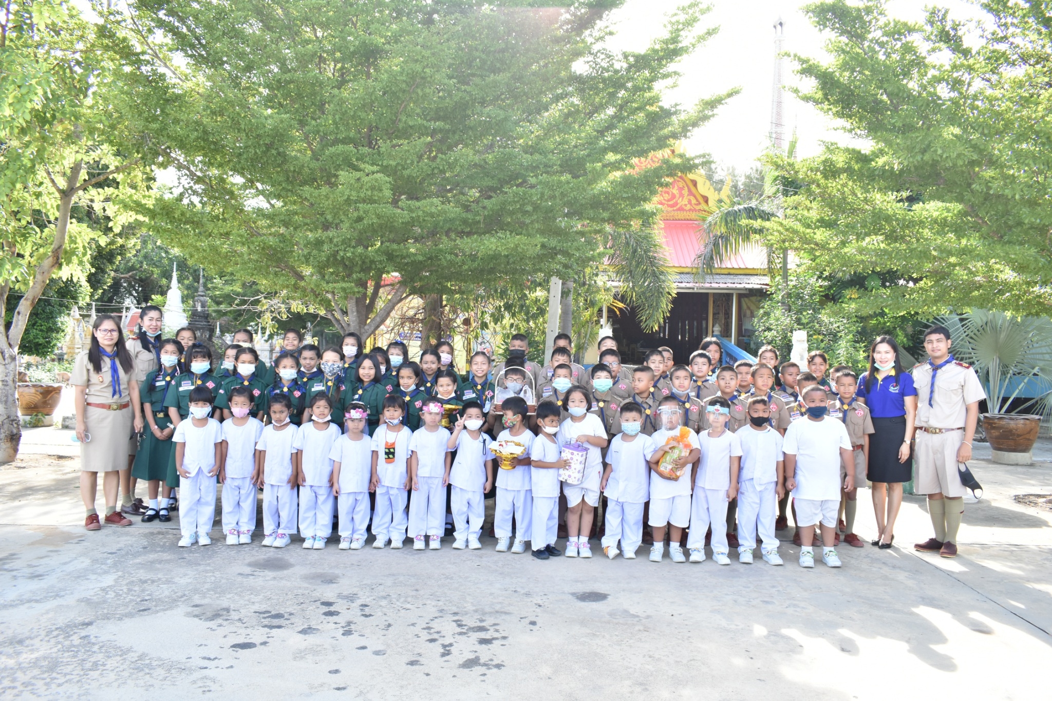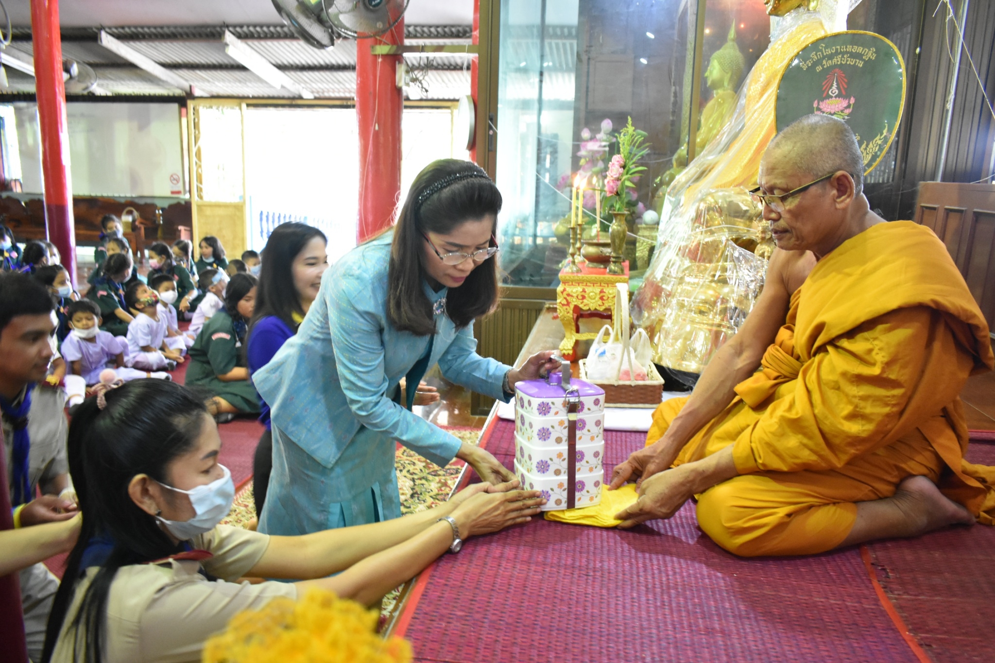ผอ.ยุวลักษณ์ ชาติชำนาญ ผู้อำนวยการสถานศึกษา โรงเรียนเทศบาล ๔ วัดศรีบัวบาน นำคณะครู และนักเรียนระดับชั้นอนุบาลปีที่ ๒ และ ประถมศึกษาปีที่ ๔ เข้าวัดทำบุญ เนื่องในวันพระ