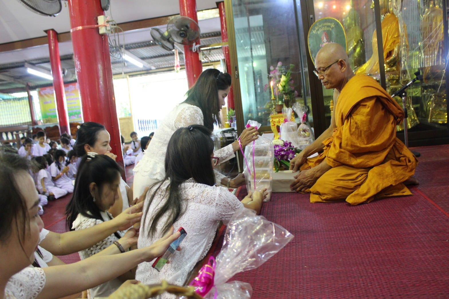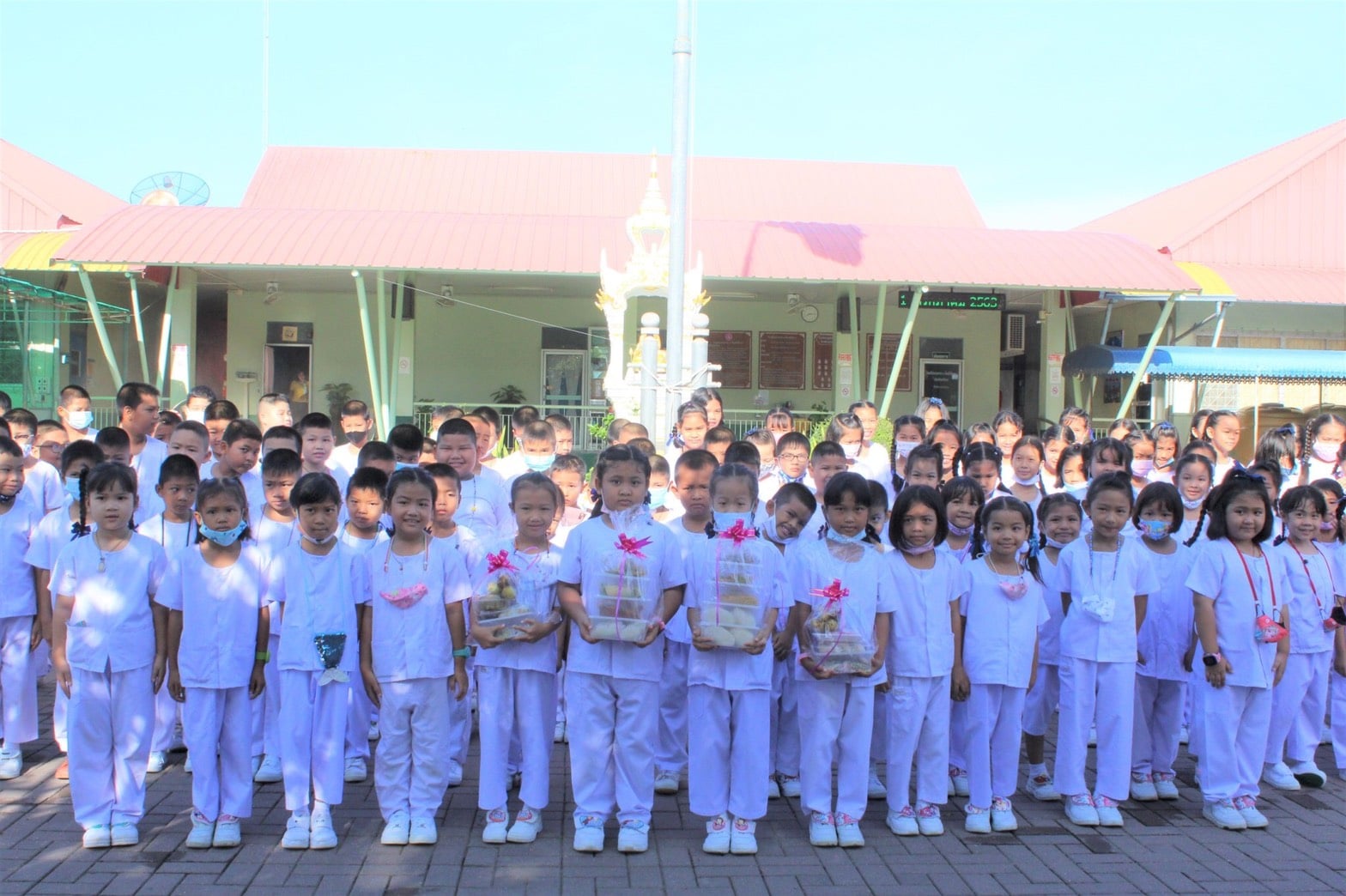 ผอ.ยุวลักษณ์ ชาติชำนาญ ผู้อำนวยการสถานศึกษา โรงเรียนเทศบาล ๔ วัดศรีบัวบาน และคณะครู นำนักเรียนระดับชั้นประถมศึกษาปีที่ ๑ ,๔ และ ๕ เข้าวัดทำบุญ เนื่องในวันออกพรรษา ประจำปี ๒๕๖๓ ในวันที่ ๒ ตุลาคม ๒๕๖๓ ณ วัดศรีบัวบาน
