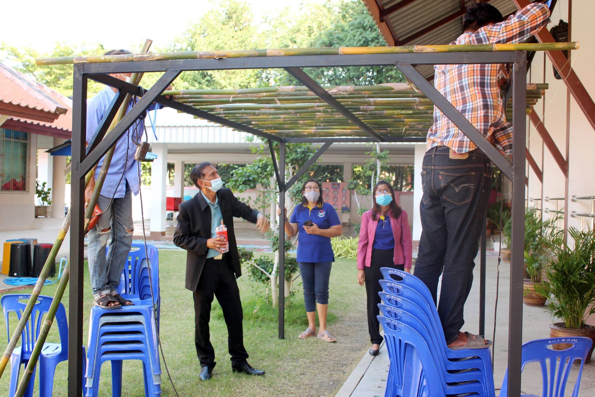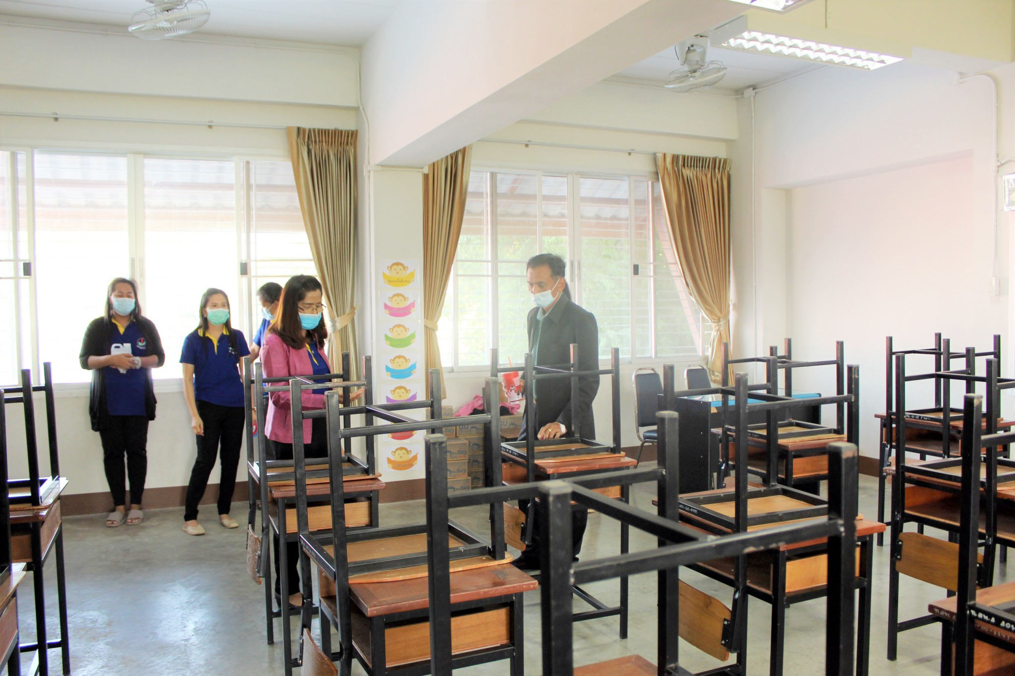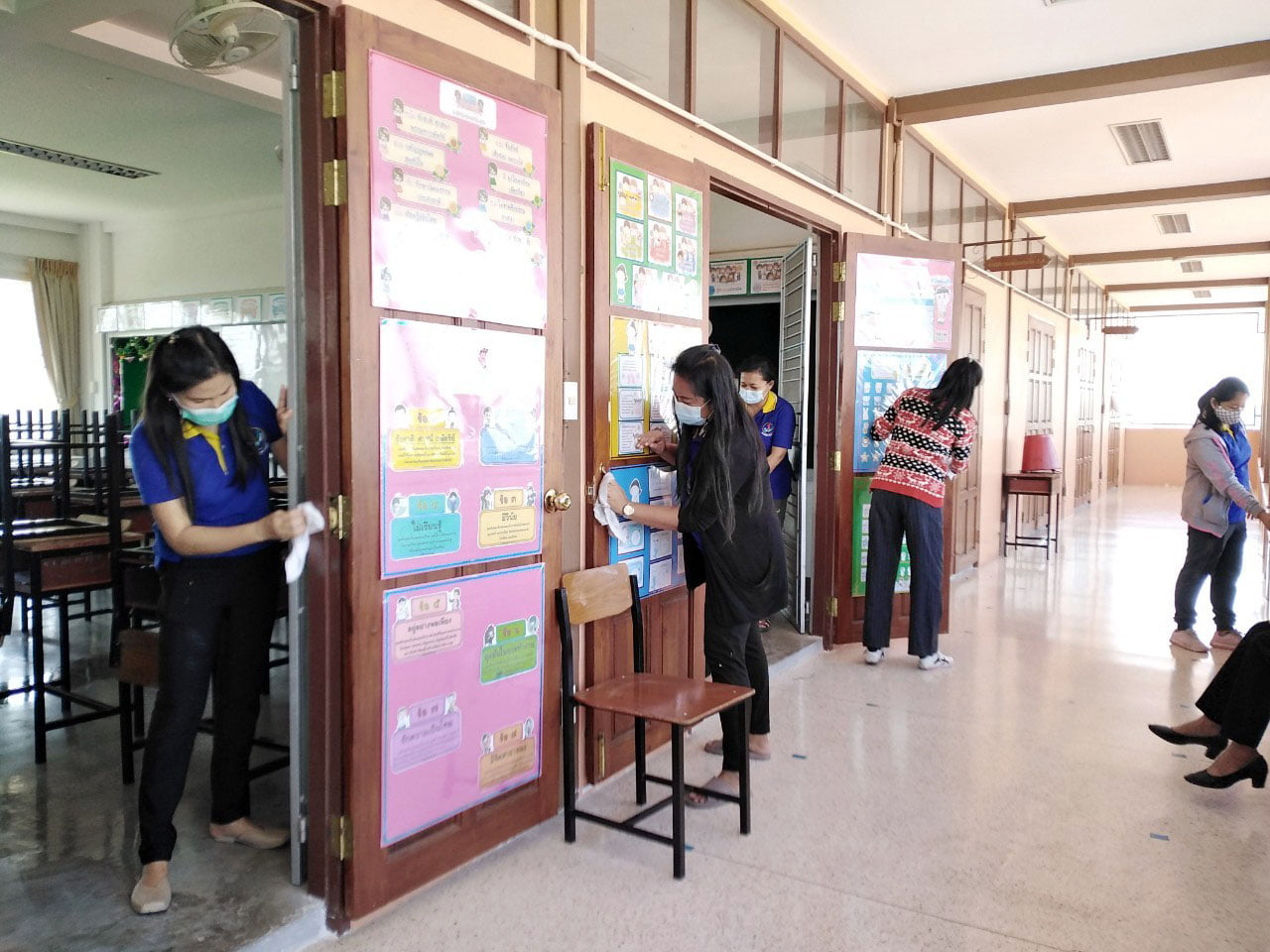 ผอ.ยุวลักษณ์ ชาติชำนาญ ผู้อำนวยการสถานศึกษาฯ ต้อนรับ ผอ.ดำรงค์ธณัช สวัสดิพรรณ์ ผู้อำนวยการกองการศึกษาฯ ที่มาตรวจเยี่ยมคณะครูร่วมทำกิจกรรม Big Cleaning อาคารสถานที่และสื่อวัสดุอุปกรณ์ที่เกี่ยวข้องกับการเรียนการสอนภายในห้องเรียน ตามสถานการณ์โคโรน่า (COVID-19) เพื่อป้องกันและควบคุมเชื้อโคโรน่า (COVID-19) วันที่ ๒๔ ธันวาคม ๒๕๖๓ ณ โรงเรียนเทศบาล ๔ วัดศรีบัวบาน