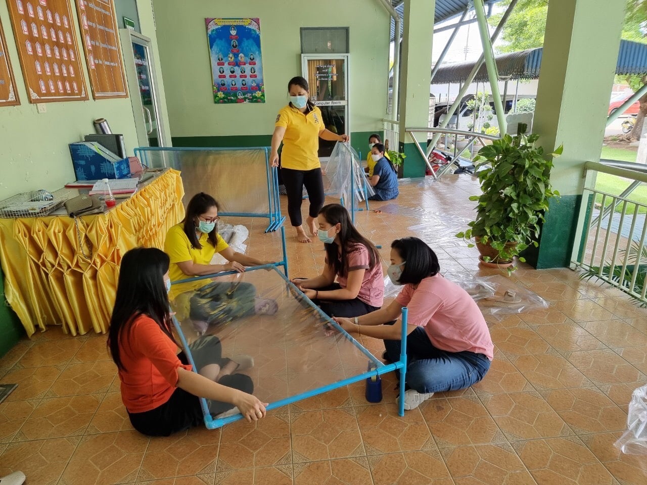 วันที่ ๑๑ มิถุนายน ๒๕๖๔ ผอ ยุวลักษณ์. ชาติชำนาญ คณะครูโรงเรียนเทศบาล ๔ วัดศรีบัวบาน ร่วมแรง ร่วมใจ ในการจัดทำแผงฉากกั้นเตรียมความพร้อมมาตรการ เฝ้าระวังป้องกันโรคติดเชื้อไวรัสโคโรนา (COVID-19) และสำหรับ รับ-ส่ง การบ้าน/ใบงาน เตรียมความพร้อมก่อนเปิดภาคเรียน ปีการศึกษา ๒๕๖๔