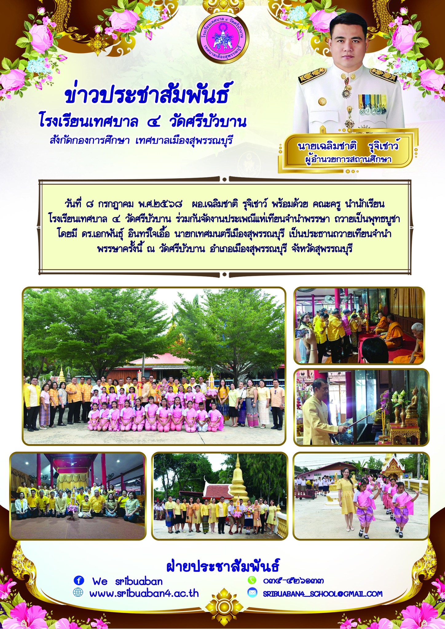 วันที่ ๘ กรกฎาคม พ.ศ.๒๕๖๘ ผอ.เฉลิมชาติ รุจิเชาว์ พร้อมด้วย คณะครู นำนักเรียนโรงเรียนเทศบาล ๔ วัดศรีบัวบาน ร่วมกันจัดงานประเพณีแห่เทียนจำนำพรรษา ถวายเป็นพุทธบูชา โดยมี ดร.เอกพันธุ์ อินทร์ใจเอื้อ นายกเทศมนตรีเมืองสุพรรณบุรี เป็นประธานถวายเทียนจำนำพรรษาครั้งนี้ ณ วัดศรีบัวบาน อำเภอเมืองสุพรรณบุรี จังหวัดสุพรรณบุรี