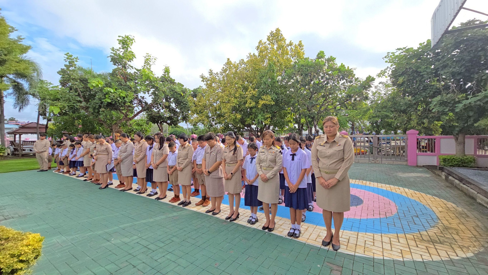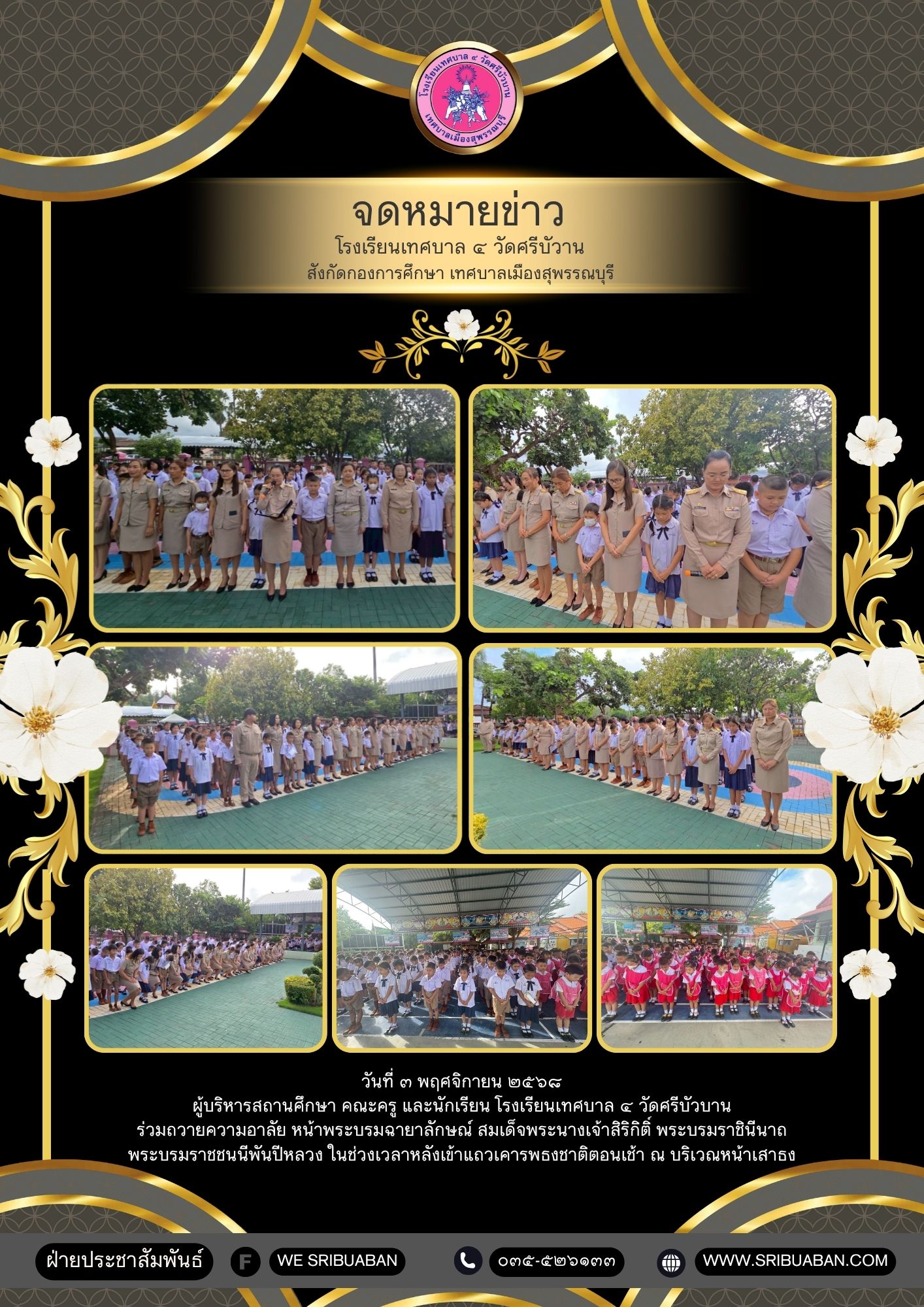 วันจันทร์ที่ ๓ พฤศจิกายน ๒๕๖๘ ผู้บริหารสถานศึกษา คณะครู และนักเรียน โรงเรียนเทศบาล ๔ วัดศรีบัวบาน ร่วมถวายความอาลัย หน้าพระบรมฉายาลักษณ์ สมเด็จพระนางเจ้าสิริกิติ์ พระบรมราชินีนาถ พระบรมราชชนนีพันปีหลวง ในช่วงเวลาหลังเข้าแถวเคารพธงชาติตอนเช้า ณ บริเวณหน้าเสาธง