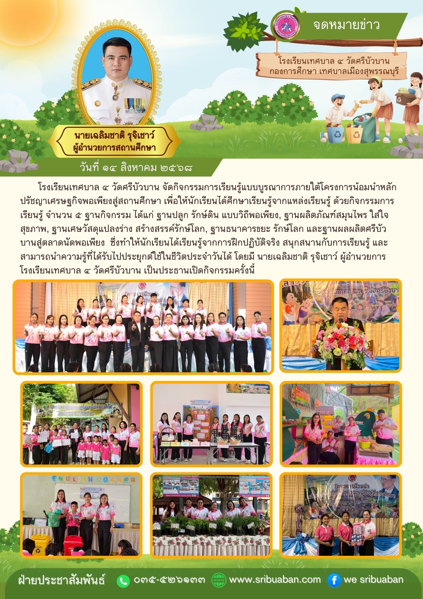 โรงเรียนเทศบาล ๔ วัดศรีบัวบาน จัดกิจกรรมการเรียนรู้แบบบูรณาการภายใต้โครงการน้อมนำหลักปรัชญาเศรษฐกิจพอเพียงสู่สถานศึกษา เพื่อให้นักเรียนได้ศึกษาเรียนรู้จากแหล่งเรียนรู้ ด้วยกิจกรรมการเรียนรู้ จำนวน ๕ ฐานกิจกรรม ได้แก่ ฐานปลูก รักษ์ดิน แบบวิถีพอเพียง, ฐานผลิตภัณฑ์สมุนไพร ใส่ใจสุขภาพ, ฐานเศษวัสดุแปลงร่าง สร้างสรรค์รักษ์โลก, ฐานธนาคารขยะ รักษ์โลก และฐานผลผลิตศรีบัวบานสู่ตลาดนัดพอเพียง ซึ่งทำให้นักเรียนได้เรียนรู้จากการฝึกปฏิบัติจริง สนุกสนานกับการเรียนรู้ และสามารถนำความรู้ที่ได้รับไปประยุกต์ใช้ในชีวิตประจำวันได้ โดยมี นายเฉลิมชาติ รุจิเชาว์ ผู้อำนวยการโรงเรียนเทศบาล ๔ วัดศรีบัวบาน เป็นประธานเปิดกิจกรรมครั้งนี้